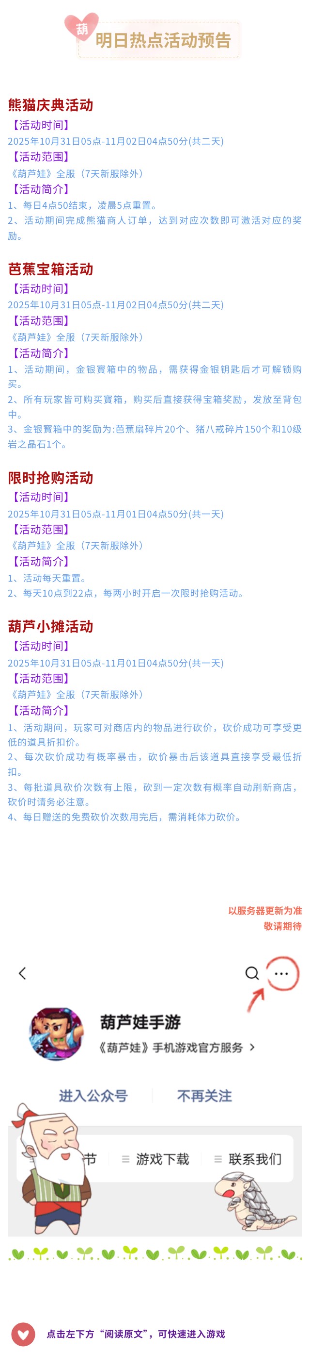 葫芦娃【葫芦娃】10月31日活动预告如下: