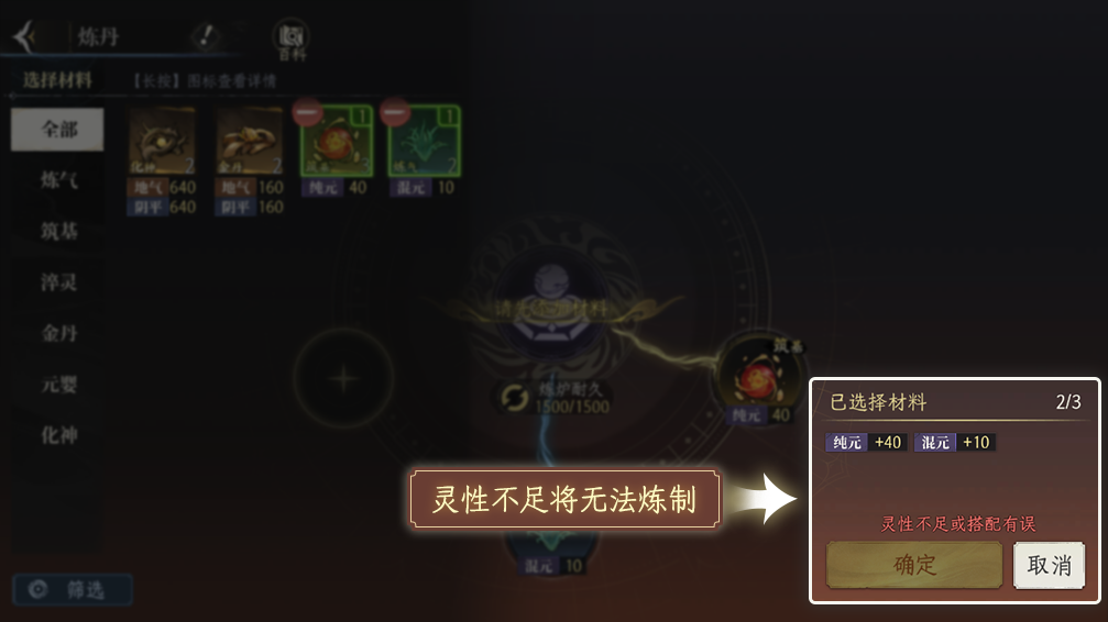 炼制前提:放入的炼制材料 需满足“灵性标签搭配合理”+“总灵气达标”,当灵性标签搭配和总灵气不满足任意配方要求时,则无法进行炼制。