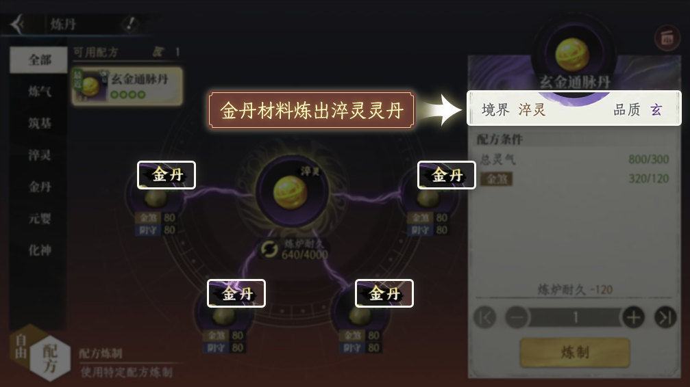 以淬灵神品的庚金通脉丹为例,蛙娘从神锋门宗主身上讨来了配方,但没有对应的配方材料。