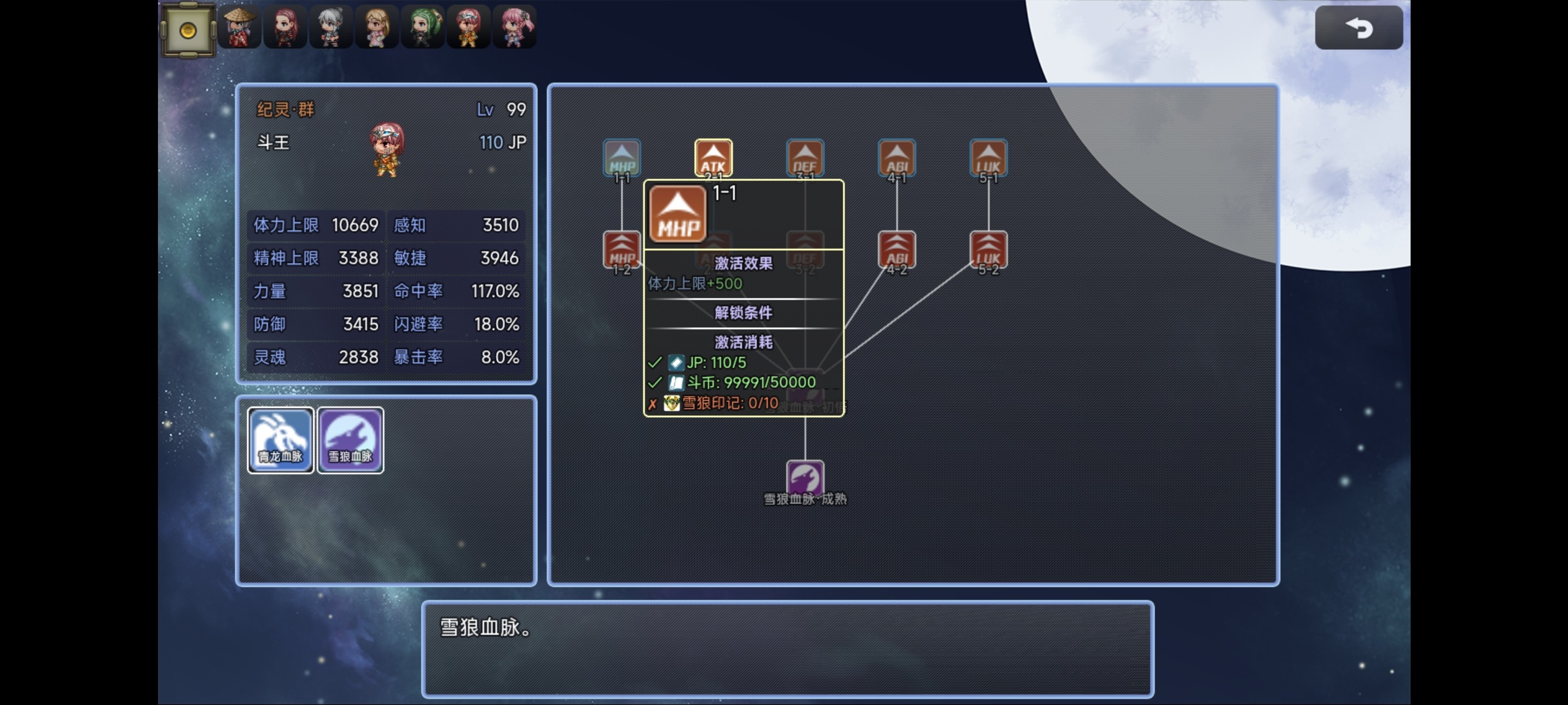 2.以下人物:颜良、文丑、张颌、造纸农、高顺、吕布、华雄、纪灵、梁纲、吕旷、吕翔、墨染青衣颜、宋仁、宋勇、糜芳、巩志、许攸、赵云、魏延、黄忠在队,准备若干雪狼印记,开启雪狼血脉,该血脉加点消耗jp值、斗币、雪狼印记