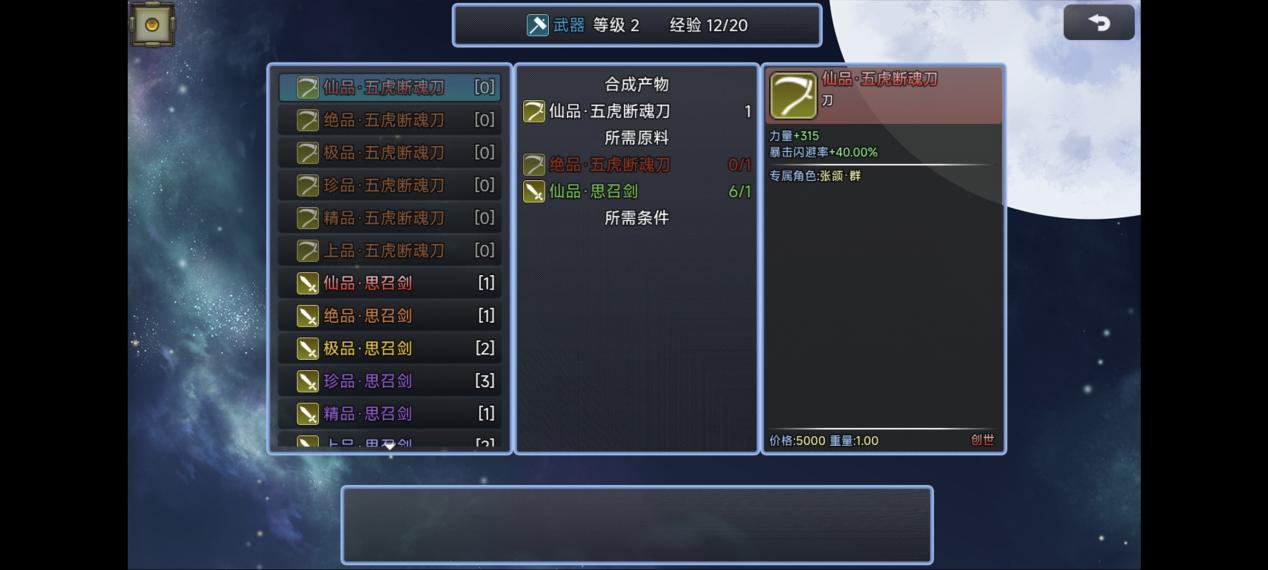 五虎断魂刀+上品思召剑=上品五虎+精品思召剑=精品五虎+珍品思召剑=珍品五虎+极品思召剑=极品五虎+绝品思召剑=觉品五虎+仙品思召剑=仙品五虎断魂刀