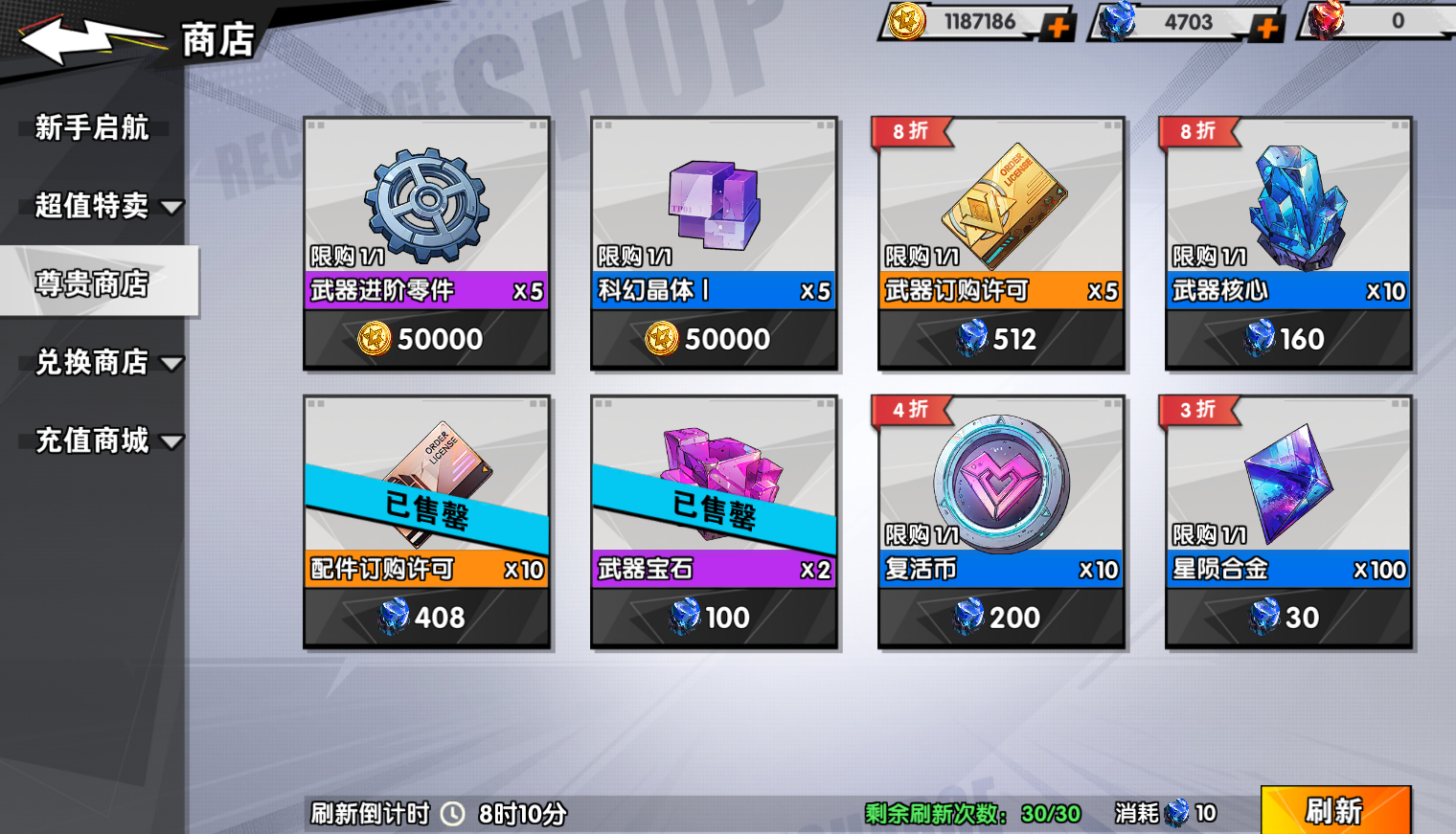 (3)星石可以在【尊贵商店】换取很多资源,商店内容每天可以免费刷新几次,最低6折七百多星石换10张抽卡券,里面还有一些突破材料可以还,技能、武器等级卡级的时候可以去刷新一下尊贵商店,换取一些突破材料。