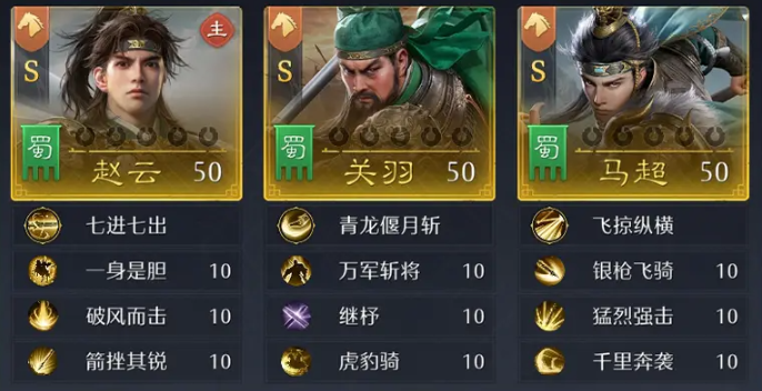4、注意:关羽纯辅助位,马超和赵云提供输出,阵容比较好凑出来pvpT1守门员;队伍也可以切换为枪兵,换枪兵时,虎豹骑要下掉换成全军突击。