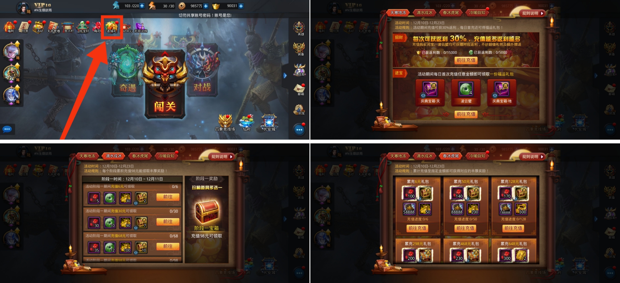 tips:微氪玩家或氪佬玩家搭配“滴水成冰”活动可分多个阶段购买礼包,在第一个阶段购买68元或其他金额的礼包,等下一个阶段开启时再购买其他金额的礼包,尽量使“氪金收益”最大化。
