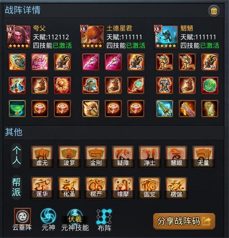 1、土德星君+盘古+后土,在天梯排位、帮派战九州及四象竞技场有着不俗的表现;