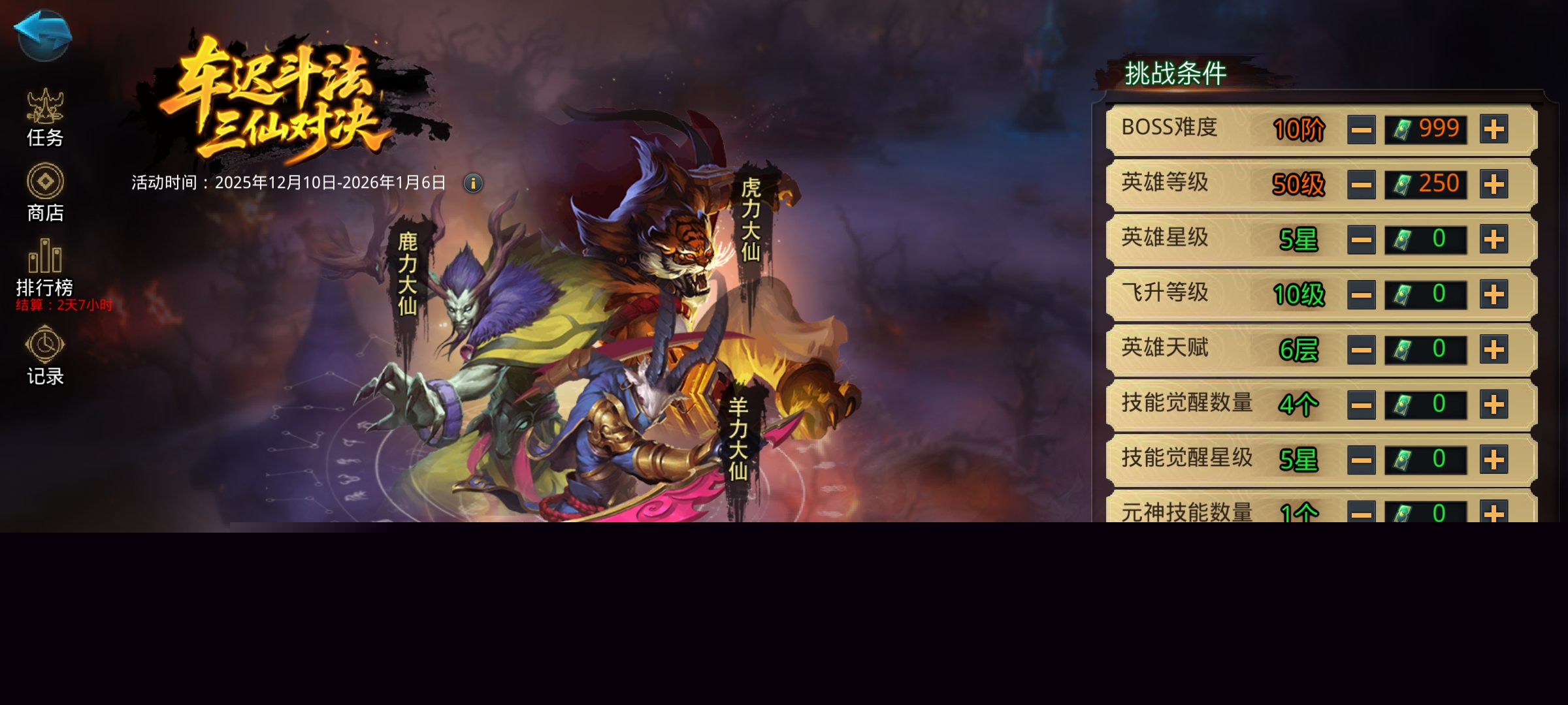 通关第一章后解锁活动;可选择自己已拥有的英雄前往秘境探险,探险过程中该英雄的所有属性均由秘境提供。探险开始前可自由切换选择英雄、布阵、阵法、法宝、灵器等内容挑战羊力、虎力、鹿力三位大仙;无双决我之前发布过一篇攻略贴,感兴趣的可以去我主页里找一下看看,或者是看看其他的大佬出的攻略,虽然BOSS换了,但是方法还是一样的,这里就不多做介绍了。