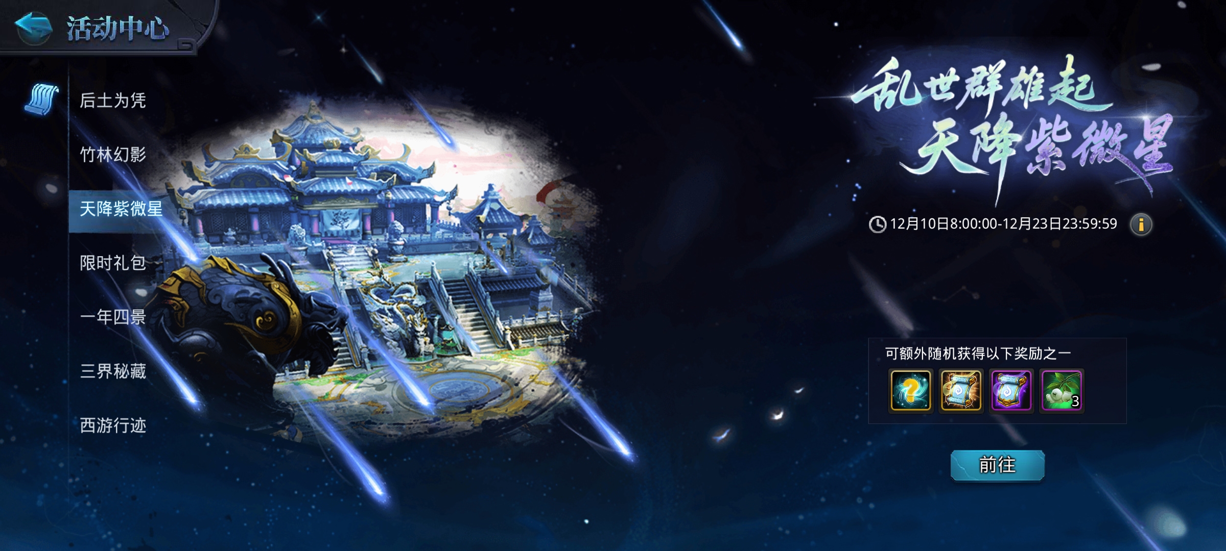 天降星辉特殊活动也是复刻了,天降紫微星活动会在角色等级达到20级后开放,活动期间星辉将会变成紫微星,但刷新逻辑与刷新位置与原先一致。采摘星辉可额外获取随机九霄灵、合成·金色魂印等珍稀道具,一定要记得每周二、四、六去长安城、瑶池等地图采摘哦~