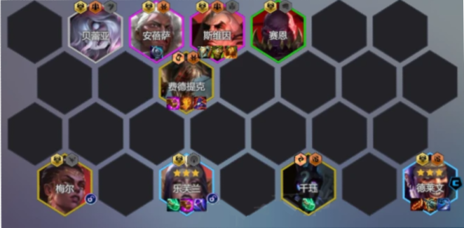 1.阵容组成:梅尔+赛恩+贝蕾亚+千珏+安蓓萨+费德提克+斯维因+乐芙兰+德莱文