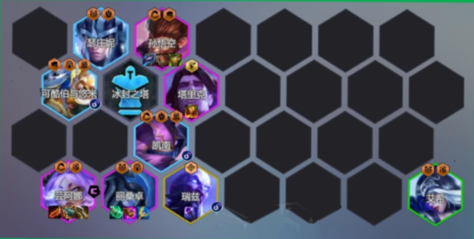 阵容组成:孙悟空+瑟庄妮+冰封之塔+塔里克+凯南+可酷伯与悠米+艾希+瑞兹+丽桑卓+芸阿娜