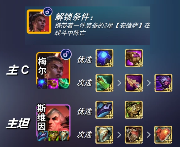装备搭配:主C梅尔优选装备(蓝BUFF、帽子),次选(法爆、科技枪);主坦斯维因:优选装备(日炎、狂徒),次选(反甲、石像鬼)