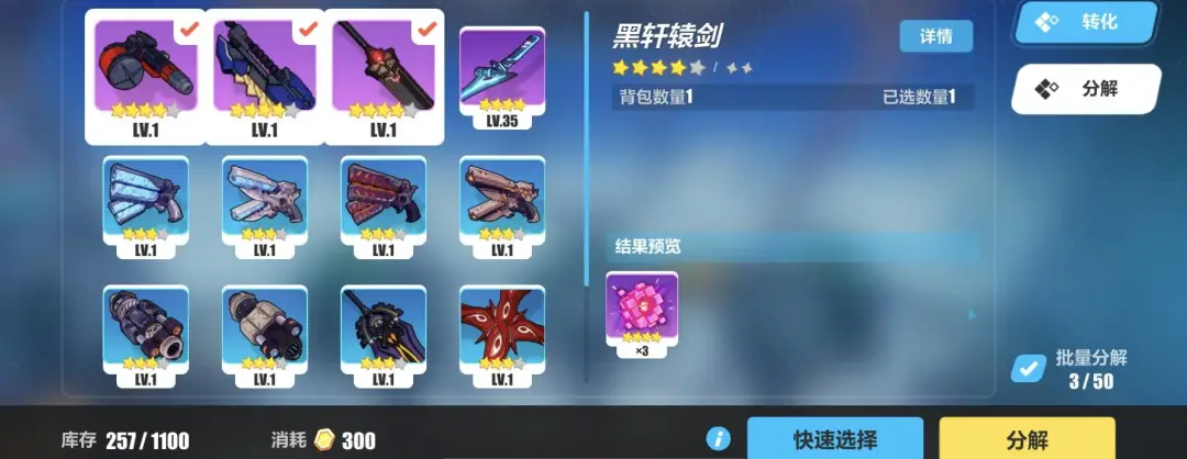 TIPS:用逆熵·虚数核心锻造的武器并不推荐进化,后期都会被上位代替。另外,如果黑核有富余的话,推荐先兑换未解锁过的武器开图鉴,再将武器分解成崩坏结晶,这样和直接兑换崩坏结晶碎片得到的结果是一样的,还能顺便开图鉴。