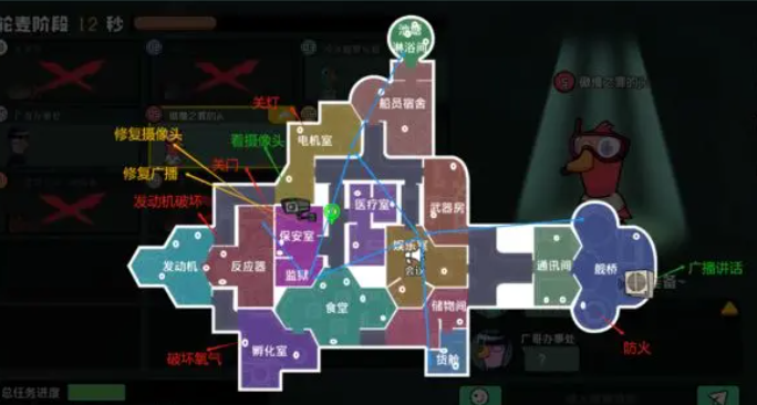 电机室:关灯任务:触发后会大幅缩小鹅和中立角色的视野范围,制造视野盲区,适合鸭子在视野缩小后,在走廊、拐角等区域伏击落单玩家,配合队友完成击杀。
