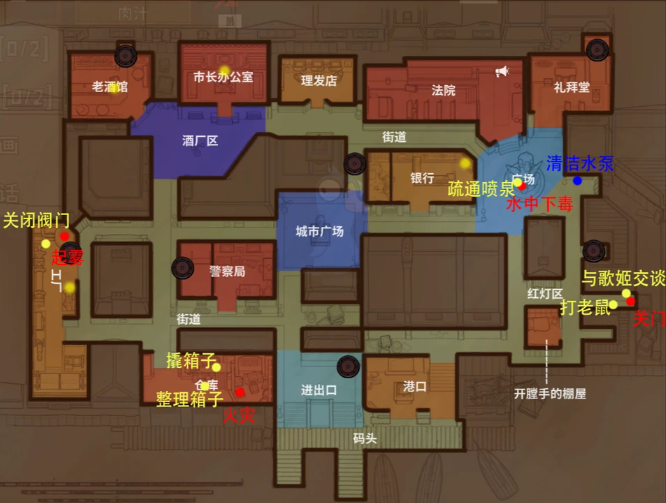 广场:下毒任务:任务触发后,鹅阵营必须在限定时间内赶到最右侧红 灯区完成水泵换水,才能解除下毒的负面影响,若超时可能会面临阵营失利的相关惩罚,鸭阵营可趁机埋伏在红 灯区附近,偷袭前去换水的落单鹅玩家。