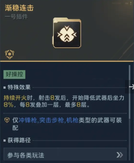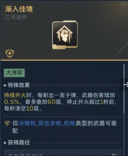 3、插件3号位:推荐【渐入佳境】,该配件稳定30的增伤,打BOSS输出,更加可观,官方推荐的击杀增伤也不错,但可惜,死亡就不享受加成,不如这个更稳定一些