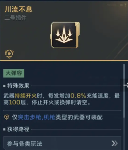 2、插件2号位:推荐【川流不息】,这个天赋可以大幅提升,我们开火期间,充能效率,且999不需要换弹可以吃满,该配件的属性。