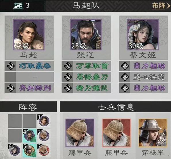 2、兵种推荐选择藤甲兵或陷阵营在前排抗伤,中后排选位补充一个穿杨军或连弩军进行补伤。