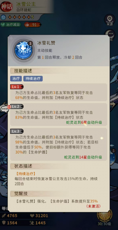 冰雪公主在游戏中属于是神话品质的蛇灵,自身拥有的影响能力是针对敌方的治疗减益,她的第一个技能就是冰雪礼赞,使用时需要主动释放,可以带来的治疗时间很长,属于是一类持续治疗的效果,冰雪公主会挑选此时己方队友内生命占比最低的3名队友,为他们恢复等同于攻击68%的生命值,此时还可以附加一个【持续治疗】的状态,而在升级达到6星自动升级为己方生命占比最低的3名队友恢复跟冰雪公主攻击数值83%一样的生命值,一样会带来【持续治疗】的状态加成,最高是在有14星的时候可以自动升级,此时就是找到我方队内生命数值最低的3名目标,恢复等同于自己攻击上面98%的生命值,如果是这个队友的生命值低于50%的情况下,这个技能还可以让这个队友额外获得等同于攻击30%的[生命护盾],而这里的【持续治疗】生效的话,就会在每回合结束的时候恢复冰雪公主攻击数值上面15%的生命,后期在蛇灵觉醒之后还会有冰雪礼赞强化后的状态,此时在生命护盾的数值上面会有35%的增长。