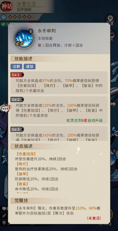 而另外一个主动技能就是永冬审判这个必杀技,可以针对群体敌人带来减益,此时可以对敌方全体造成97%的法伤,70%概率使目标获得伤害加深]的影响,然后带来的控制能力当中还有降疗、破甲、致盲这几个可以进行随机触发,每一次触发是从其中随机挑选1个负之后冰雪公主会对敌方全体造成143%的法伤,此时100%概率使目标获得伤害加深]的影响,但是此时在负面效果上面除了基础的三个之外,还增加了冰冻、沉默,虽然也是随机选择1个负面状态,但是这个时候大家可以选择的影响能力变多了,此外还有40%概率额外为目标施加1层[寒冷]的状态,伤害加深会让敌人所受伤害提升20%,所以也可以看做是我方的一个提升技能,而降疗的效果就是会让目标受到的治疗效果降低20%。