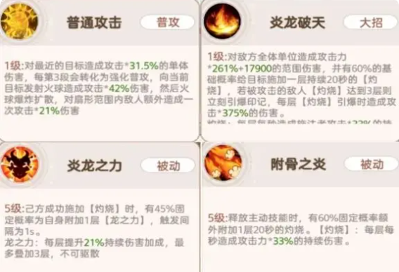 1、小炎龙高额的群体伤害以及叠加灼烧并且引爆的机制。