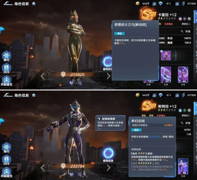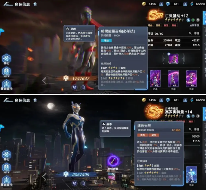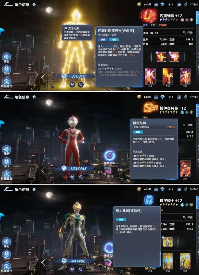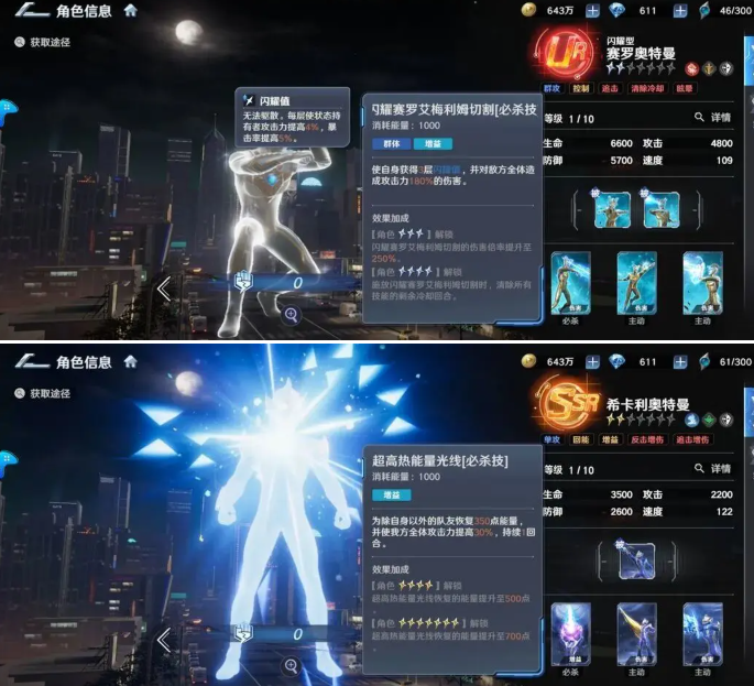 闪耀赛罗奥特曼:公认的强,群体技能倍率来到了250%,单体输出在理想情况下也能来到600%,不管是清图还是打boss都有很强的统治力。可以作为任何阵容的终极答案。