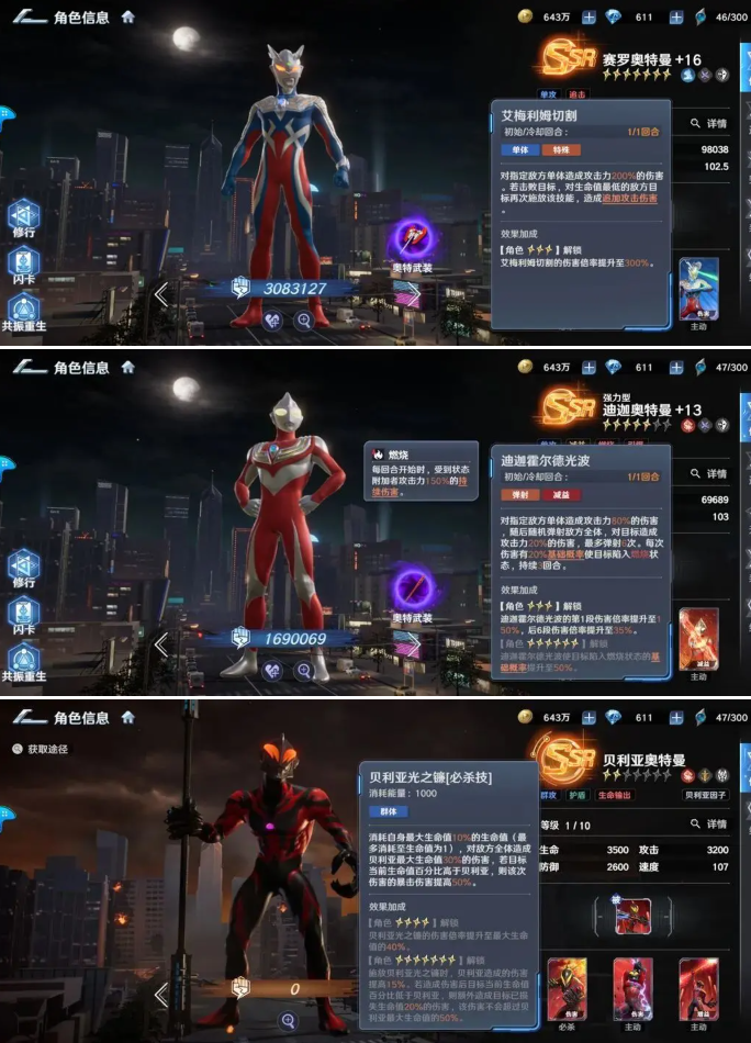 T1:普通赛罗、强力迪迦、贝利亚、亡灵基纳、赛罗月神奇迹型、盖亚至高型