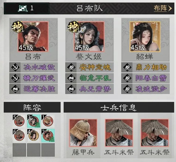 1、英雄站位:貂蝉不占用追击格。吕布站貂蝉的追击格,并与蔡文姬互站追击格。