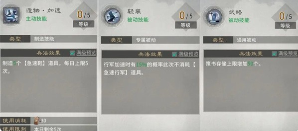 主动技能【造物·加速】制造急速靴。被动技能中,【轻装】“概率不消耗急速靴”满级仅15%,收益较低,建议优先提升【武略】。