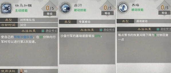 主动技能【快马加鞭】“二次加速”需额外消耗急速靴,性价比低;【疾行】行军速度加成满级只有10%,效果有限;【养晦】策书恢复速度根据策书上限调整。