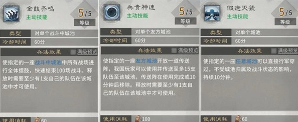 【假途灭虢】使城池内部队无视卡位行动,满级消耗60策书,适用性较窄。