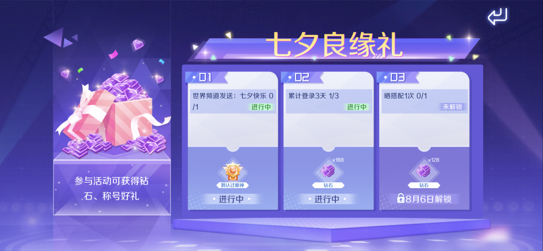 截止至8月11日,参与【七夕良缘礼】活动,在世界频道发送:七夕快乐即可获得专属称号-鹊认过眼神!累计登录3天&晒搭配1次共计可得316钻!