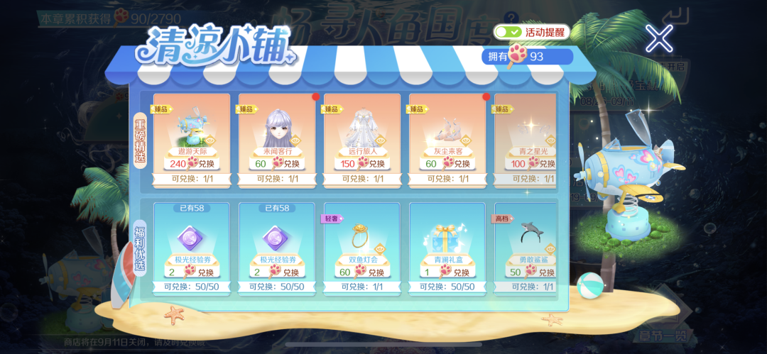 清凉小铺持续营业中!免费臻品双人座椅-遨游天际,轻奢对戒-双鱼灯会,手持-66游泳圈,背饰-夏日冲浪,极光抽奖券50通通都已经开启免费兑换啦,快去攒猫猫冰棍叭~