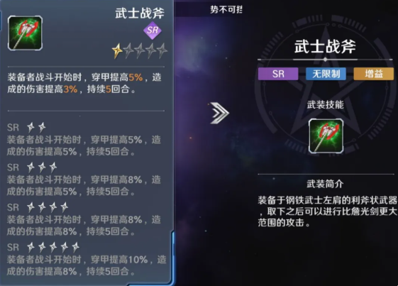武士战斧使目标获得一定回合的增伤和穿甲。均衡、生命、维护提高目标暴击和暴伤,超力量对负面目标造成伤害提高,力量优秀对护盾角色伤害提高 利用武装和闪卡叠加输出能力,搭配自身极高的冰冻几率做到能打能控。