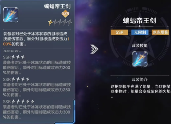 蝙蝠帝王剑使目标攻击冰冻目标额外造成伤害。均衡、生命、维护提高目标暴击和暴伤,超力量对负面目标造成伤害提高,力量优秀对护盾角色伤害提高利用武装受角色属性的特性,搭配至高高几率冰冻,持续造成高比例伤害。
