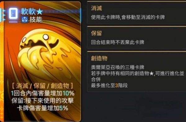 创造物卡牌支持进化系统。当玩家手牌中同时存在两张同名的一星创造物卡牌时,它们可以融合成一张二星卡牌。如果手牌中并存一张一星和一张二星同名卡牌,则可以直接融合为三星卡牌。但需要注意的是,三星卡牌无法通过融合两个二星卡牌来获得。软软、巧巧和壮壮都是0费技能卡牌。使用软软可以在一个回合内使伤害量提升10%,如果将其保留下来,则会使接下来使用的攻击卡伤害额外增加5%。