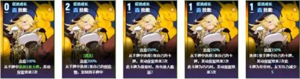 “促进成长”是一个1费技能,可以解锁50%的治愈效果。如果选择自身牌库中的创造物卡牌作为目标,则可以触发两次该卡牌的预留效果。例如,如果选择的目标是一星壮壮卡牌,那么壮壮提供的治愈效果将从30%提升至60%。该技能的首张版本会自动降低费用,而第二张版本虽然会增加费用,但会加入削减词条,其效果也会变为复制手牌中的一张创造物卡牌。