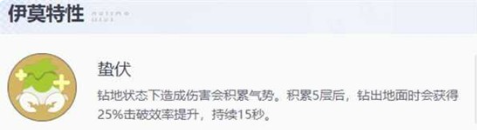 花芽蟹是伊莫土系阵容的核心选择,拥有土与草双属性,定位击破型宠物,基础属性428。其钻地技能可免疫远程攻击,但需警惕地震类技能。战斗特性包含蛰伏与蓄势待发,钻地期间积累气势层数,满5层钻出后获得25%输出提升与击破加成,持续15秒。