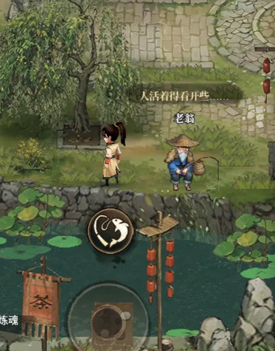 2、进入龙岗镇城门后,过桥寻找河边的老翁NPC。