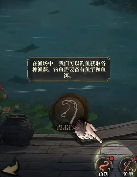 1、钓鱼需提前备齐鱼竿和鱼饵:点击屏幕右下角的功能按钮,选择适配的鱼竿和鱼饵。