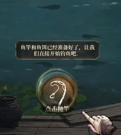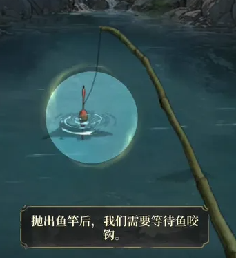 工具准备完毕后,点击界面中的【抛竿】按钮,即可将鱼钩投入水中,等待鱼群咬钩。