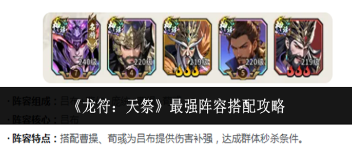 初入游戏,面对龙符天祭最强阵容怎么搭配的疑问,新人无需过度纠结。关键在于结合自身资源,集中培养核心武将。以下这份龙符天祭最强阵容搭配攻略将深度解析主流体系,助你快速构建兼具输出与承伤的实战队伍。