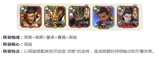 【持续灼烧体系】围绕周瑜构建点燃联动机制,搭配高顺、董卓、曹操、周泰。高顺、周泰、董卓共同施加“点燃”状态,叠加层数后由周瑜触发范围引爆,形成持续递增的灼烧伤害。董卓与周泰双前排组合保障生存容错,使周瑜得以稳定站桩输出,尤其适合中后期持久战与副本攻坚场景。