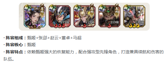 【均衡续航体系】甄姬作为治疗中枢,联动张郃、赵云、董卓、马超形成攻守兼备结构。甄姬提供高频群体回复与状态净化,确保全队血线长期处于安全区间;董卓稳固前排承伤,马超与赵云担任双突进输出位,兼顾爆发与压制能力。该体系泛用性强,对操作容错率高,适用于各类PVE挑战及常规竞技匹配。