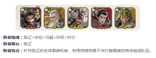 【先手压制体系】主打张辽“全体假寐”机制,配合华佗、马超、孙权、甘宁形成无缝压制链。张辽开局施加群体行动延迟效果,马超与甘宁在此期间持续触发高额伤害加成,实现全程压制输出。该配置克制高爆发、高启动类阵容,在遭遇依赖首回合出手的对手时具备显著战术优势。
