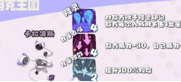 说到精灵的搭配,第一个推荐的是卡罗拉斯。这个精灵在耗能体系里属于主攻位,技能方面肯定要带降灵,同时还可以配上吸血和提升自身攻击力的技能,这样他自己的血量能保持健康,也不用担心太快被打下场,可以多回合持续输出降灵效果。