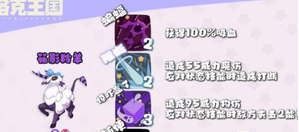 第三个是花影羚羊,偏控制方向。她可以带蝙蝠技能,直接吸走对面的血量来补充自己,生存压力比较小。除此之外,她还有两个控制技能,一个是阻挡,能打断对面正在释放的技能;另一个是惊吓盒子,可以直接减少对面两格能量,让他们短时间内没办法快速回到高能量状态。