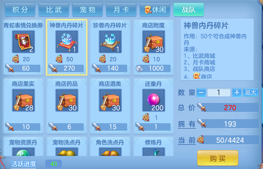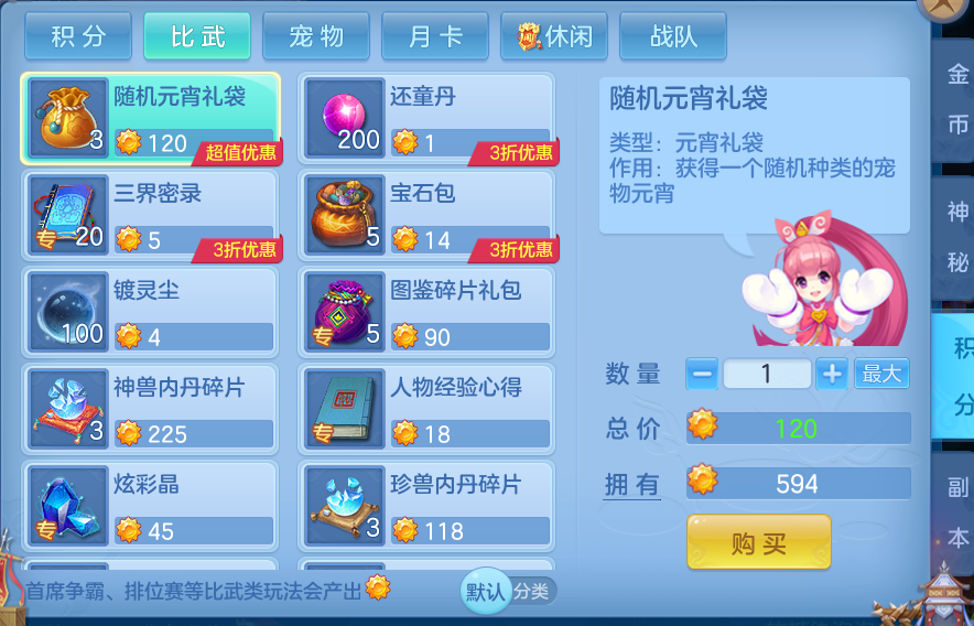 这个主要是晚上和周末的活动,像晚上的首席、排位赛,周末的三界、魂石都可以参加,可以挂机混积分,这个积分换神兽内丹就行,有多的自己可以考虑换元宵和宝石袋。