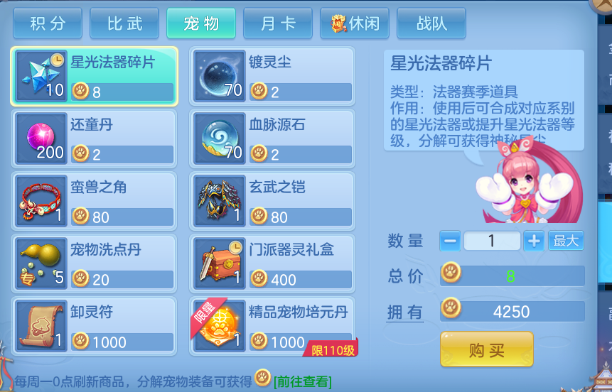 也是每周刷新,修炼丹可以买一下,日常玩家每天吃5个再开10个箱子,修炼不会差太多,普通精华和高级精华,这两个是洗宠物血脉的,如果是对宝宝有追求的可以买,特别是高级精华是洗天赋,加一起6.5万银币左右,不过我推荐只买高级的。剩余的角色修炼丹和宠物修炼丹可以买下,人物角色和宠物初始有50点属性是随机加的,需要用这个东西洗掉,重新加点。宠物资质丹是用给增加宠物当前资质的(就是让宠物资金的进度条拉满),包袱和驾驭宝典也可以买下,增加宠物和自己背包格子的,也可以买下。