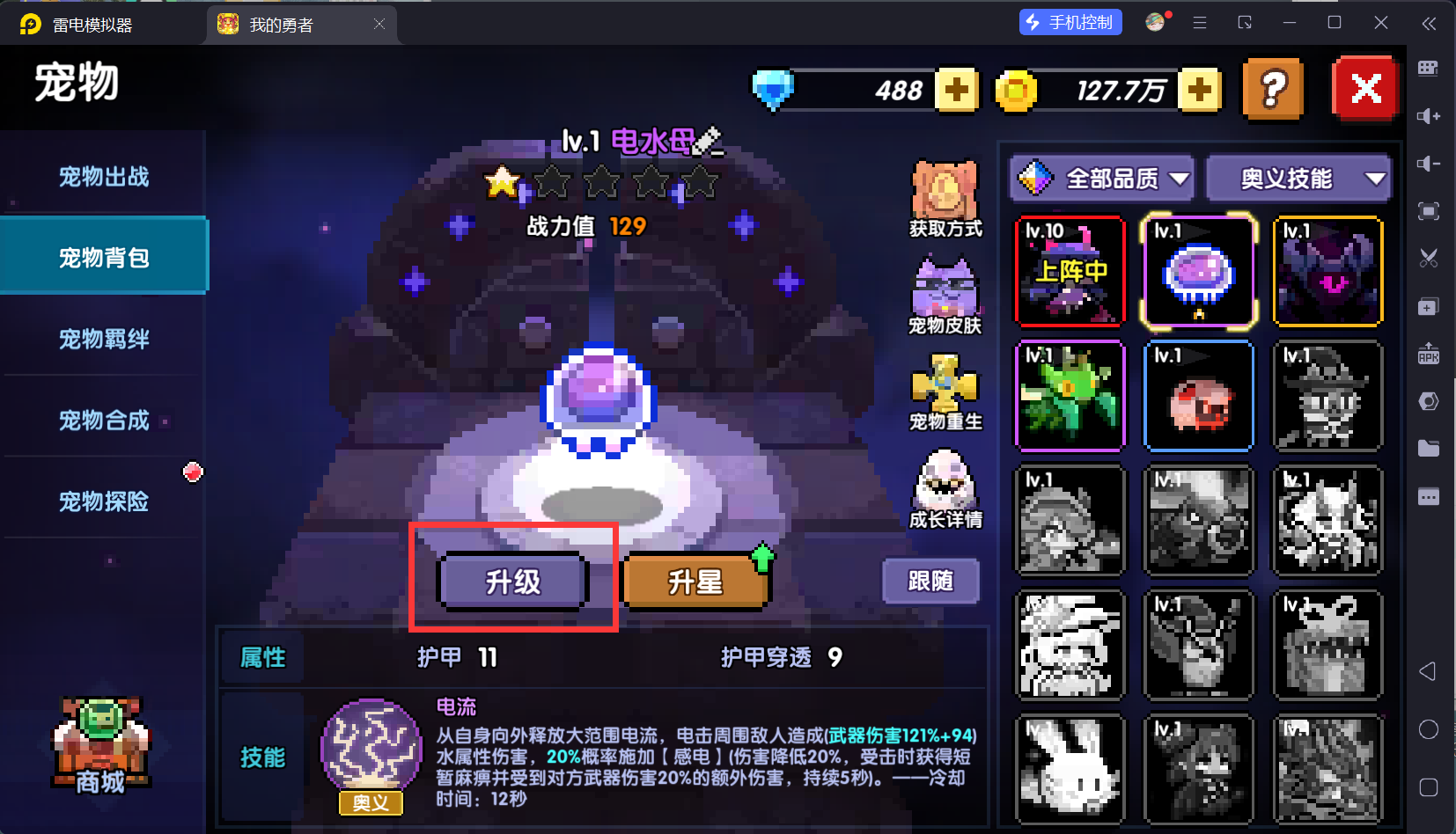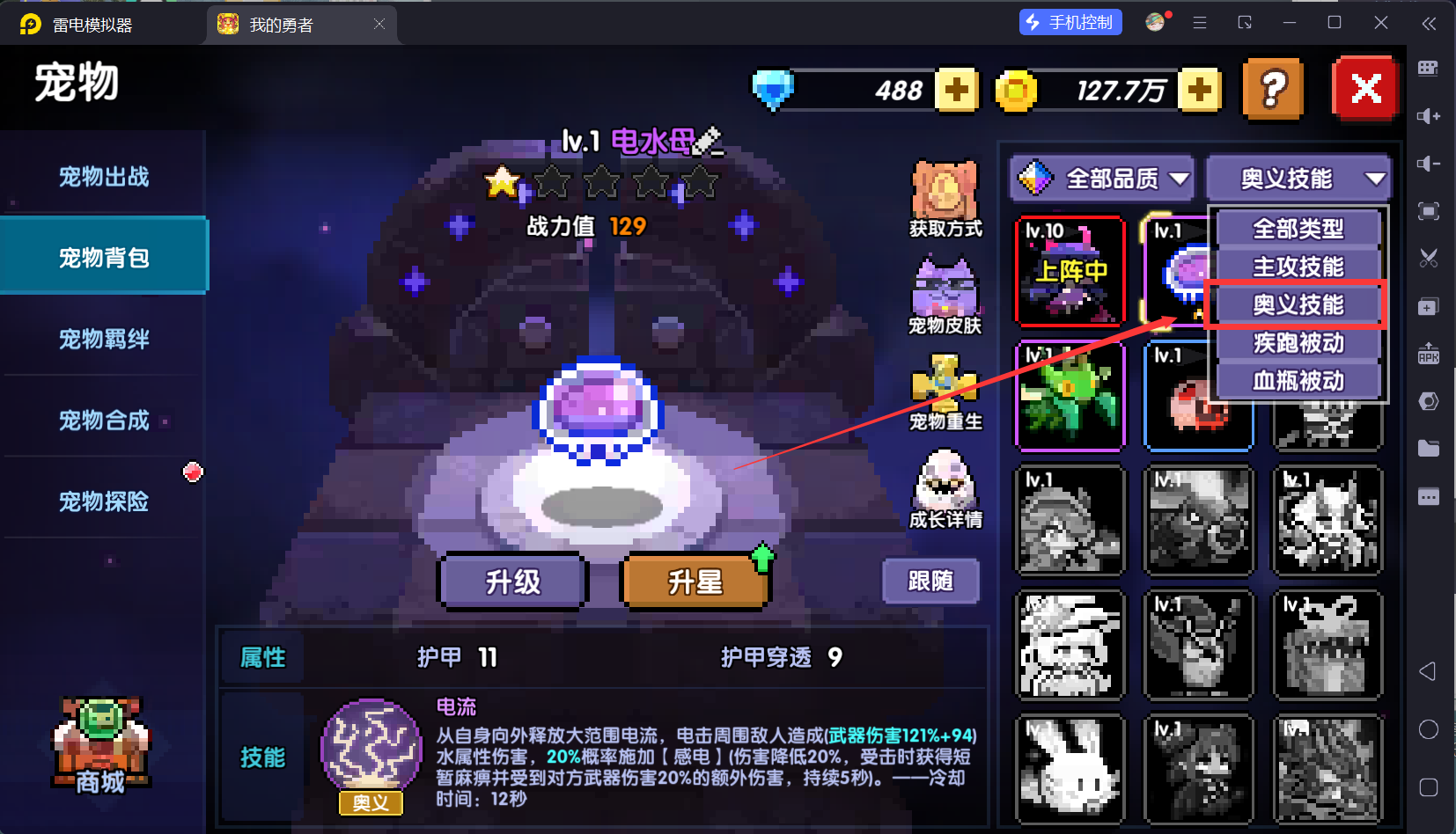 我们先给奥义位的宠物升级