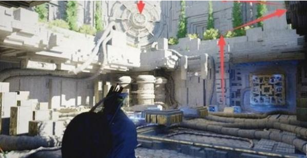 沿红色路线往上层平台走(爬墙、扒墙沿移动);