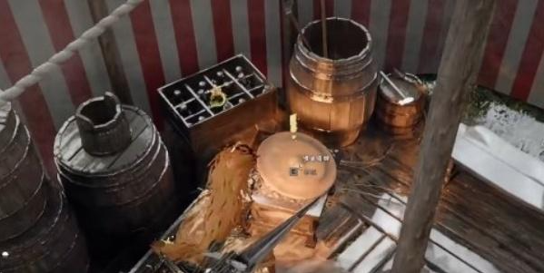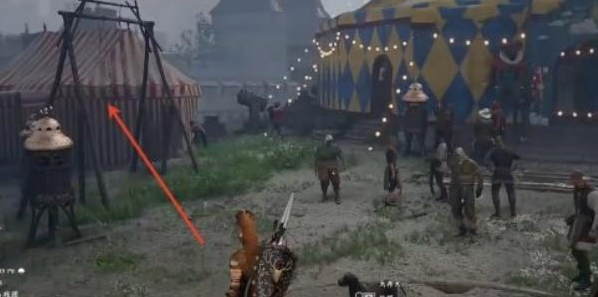 马戏团场地内有多个帐篷,找到红白竖条纹的主帐篷(最显眼、最大的那个)。